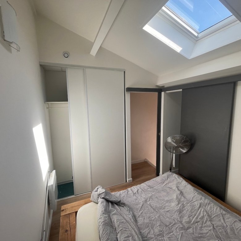 A l’étage, une belle chambre avec placard et vélux et une seconde chambre plus petite en enfilade avec